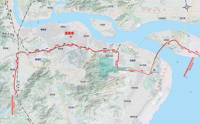 S1線一期工程:西起沿海鐵路溫州南站南端潘橋鎮(zhèn),向東北繞出至溫州西站,沿既有金溫鐵路通道至溫州東站,過溫州東站后線路折向西南沿龍灣區(qū)南洋大道、前房路至機場,在機場航站樓西側(cè)設(shè)機場站,出站后向北跨甌江南口至靈昆島折向東至一期工程終點甌采站。